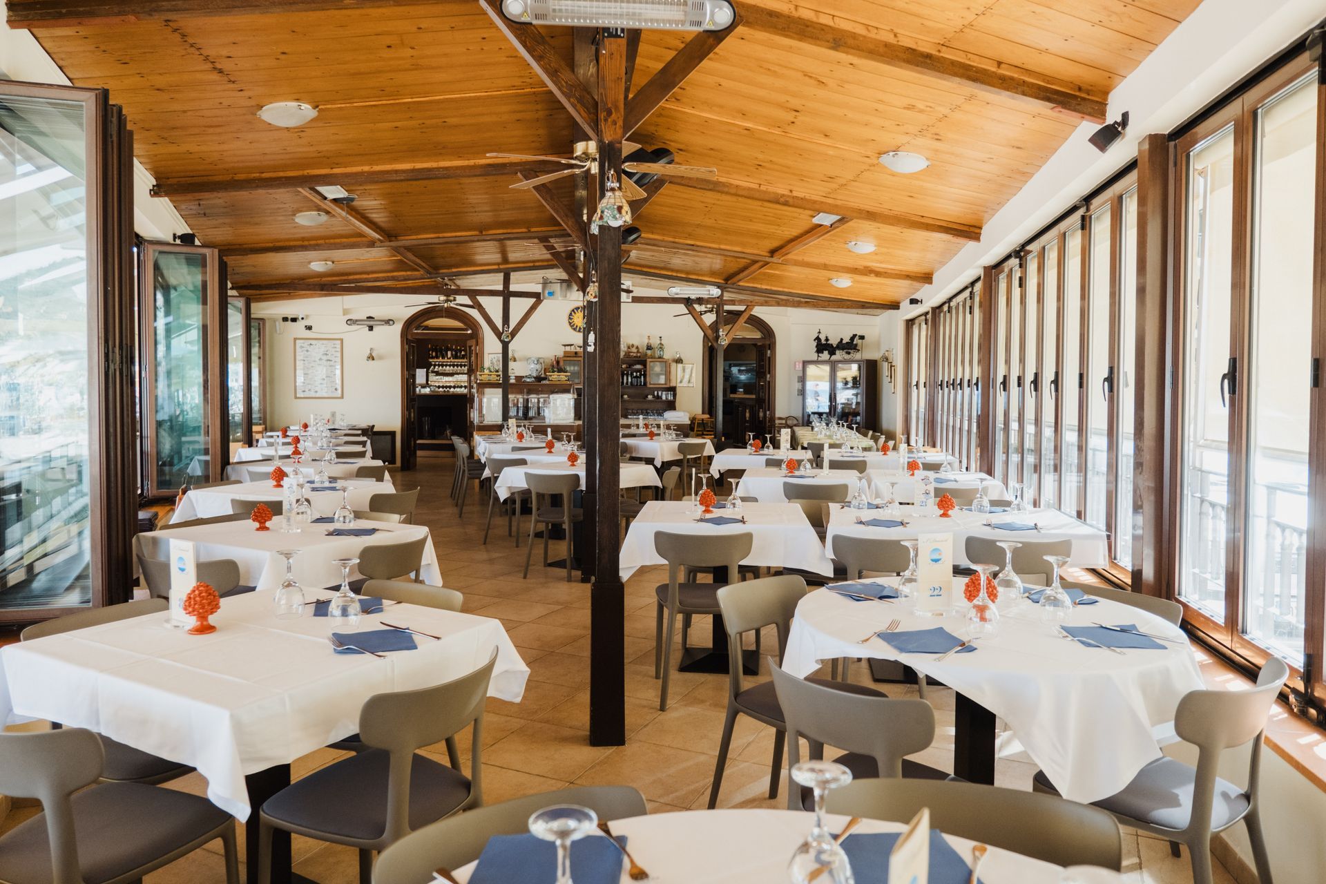 Spaziosa e luminosa, questa sala coperta ma aperta verso l’esterno garantisce comfort in tutte le stagioni. La luce naturale e la vista sull’orizzonte rendono ogni pasto piacevole e rilassante. - Sala Interna Climatizzata